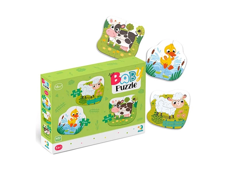 3 puzzles that respectively have 2, 2, 3 farm animal themed pieces. All puzzles measure 14x16cm and are suitable for ages 3 .