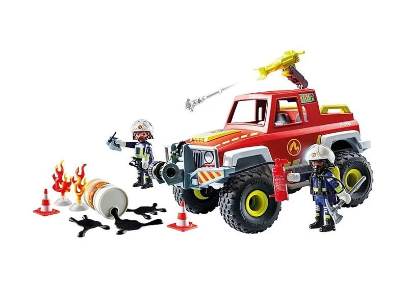 Hurry! Come to the rescue with the all-terrain PLAYMOBIL 4x4 Fire Truck! Designed for tough missions, this fire truck is packed with exciting features. The removable roof allows two firefighters to sit, while the oil stains and flames add extra drama to any scene