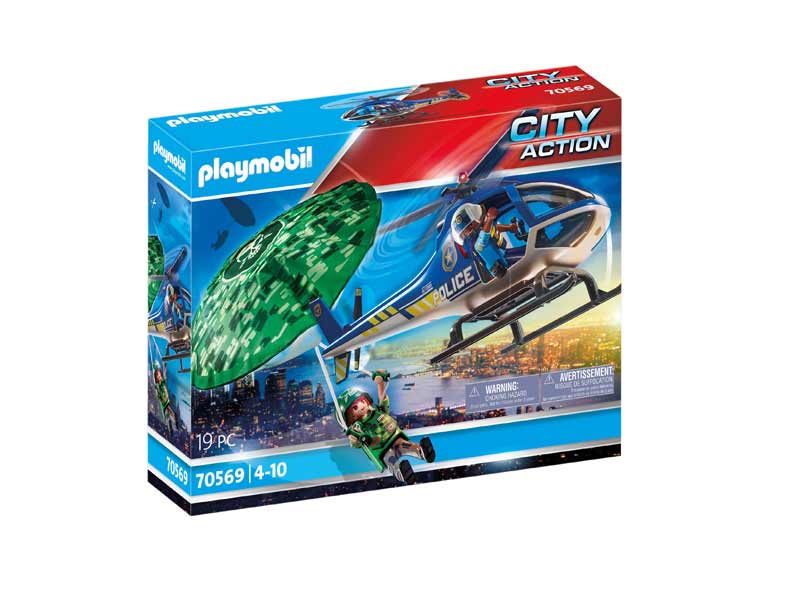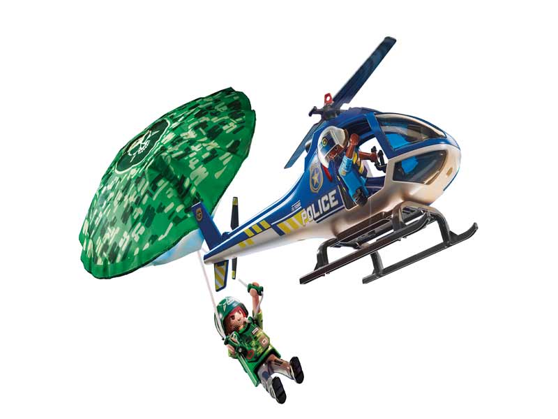 The robber goes to blow it up with his parachute but he will not succeed. The police helicopter is taking action! The parachute lands slowly on the ground.